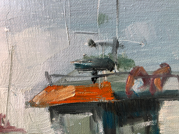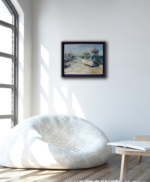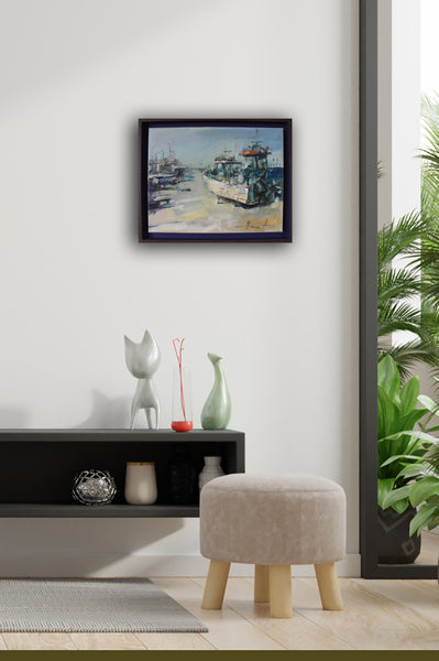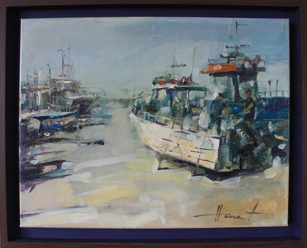 • "Early morning, silence broken only by the voices of fishermen and the clanking of gear. In the foreground is a work scene: fishermen are preparing a boat for a voyage. The light falls softly on the white hull of the boat, reflecting in the muddy water of the port. The picture conveys the rhythm of simple but important tasks, and the romance of sea labor, in which everyday life is colored with a special poetry." Henadzy